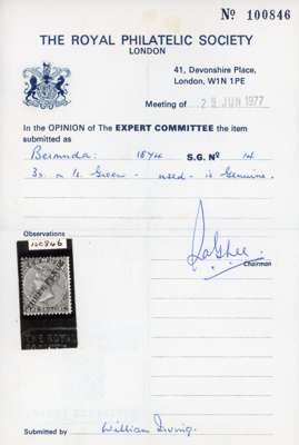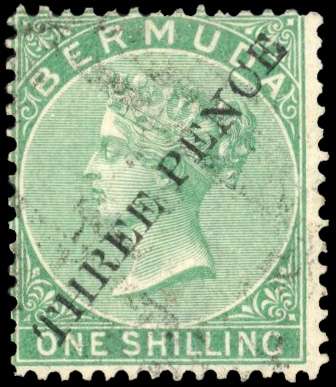 Bermuda SG 14 1874 3d on 1s green Type 7 surcharge used