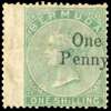 1875 1d on 1s green, wing marginal at left, showing surcharge shifted to right so that the stop does not appear, unused. Soiled, short perfs and wrinkling, but sound and a fine spacefiller for the ‘real’ missing stop variety (catalogued £40000). SG 17