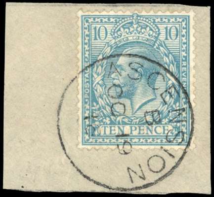 GB used in. 1913 10d turquoise-blue, neatly used on piece with OC 19 16 CDS. Scarce. SG Z50