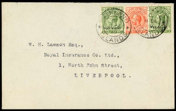 1918 1d vermilion, perf 14, on Lawson cover to Liverpool with two ½d War Stamps. The whole printing was thought to have been overprinted WAR STAMP, but a number were released without overprint; no mint are known. RPS Certificate (1986, when SG 66a). SG 61b