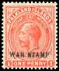 1919 War Stamp 1d orange-vermilion, comb perf, showing overprint double. Fine large part o.g., from the single sheet of the third overprinting recorded. 58 examples existed, but at least ten (in the ‘Bute’ block) are now discoloured and without gum. Holcombe Certificate (1987, when SG 92a). SG 71ca, £4500