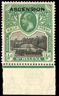 Ascension SG 1x 1922 ½d black and green with watermark reversed, lower marginal, thus showing the variety to advantage. Some slightly blunt perfs at left, otherwise fine and rare. SG 1x, £1600