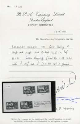 1935 Silver Jubilee set on H&A Wallace cover with Port Stanley CDSs of 6 NO 35, the 1s showing Plate ‘1’ R9/1 extra flagstaff. Very scarce, BPA Certificate (1983). SG 142a, £2500