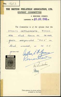 Official. 1889 24c green, watermark Crown CC, overprinted P.G.S., o.g. BPA Certificate (1948). Scarce. SG...