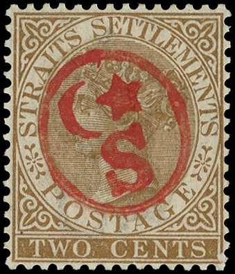 1867 Straits 2c brown overprinted in red similar to Perak and Sungei Ujong Type 1, fine large part o.g. See note before SG 1, £425