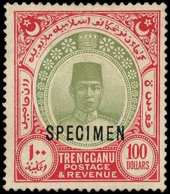 1921 $100 green and scarlet overprinted SPECIMEN Type D12, large part o.g., minor hinge remainder. SG 47s, £1100