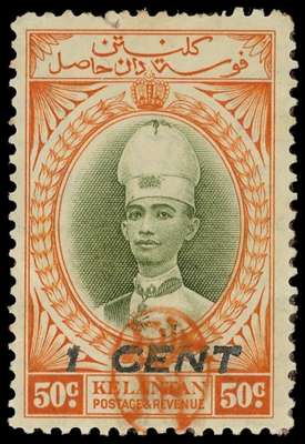 1942 Kelantan 1c on 50c grey-olive and orange with Sunagawa Seal, large part o.g. with minor pink backing paper...