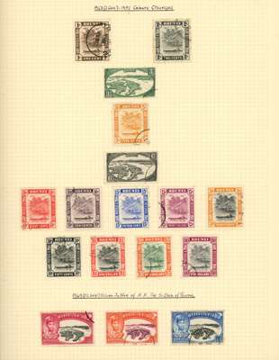 1922-52 used collection (63) on leaves with the Malaya-Borneo set used (10c colour run, other values fine), then complete basic stamps to 1952 (no Japanese Occupation). Some foxing affects the later issue, but the 1931 $1 is fine, also the 1948 $5 and $10