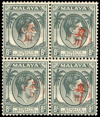 1942 Straits 8c grey with Okugawa Seal (Type III) in red, large part o.g. BPA Certificate (2023). SG J60, £168