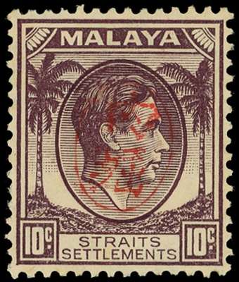 1942 Straits 10c dull purple with Itchiburi Seal in red, large part o.g. BPA Certificate (2023). SG J74, £250