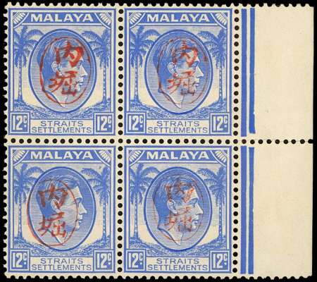 1942 Straits 12c ultramarine marginal block of four with Itchiburi Seals in red, streaky brown o.g., the upper pair large part o.g. and the lower pair full o.g. Perf separation in selvedge. BPA Certificate (2023). SG J75, £640