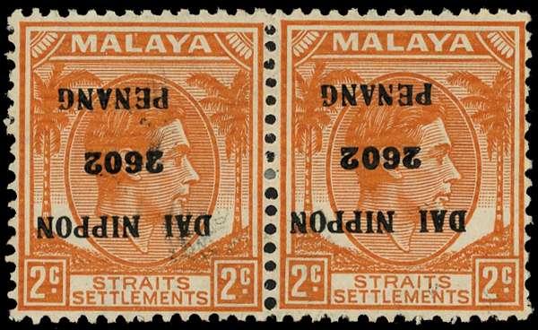 1942 Straits with DAI NIPPON 2602 PAHANG. 2c orange pair large part o.g., overprint inverted, a little smudged on the left stamp otherwise fine. SG J78a, £340