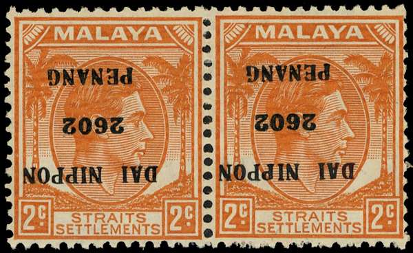 1942 Straits with DAI NIPPON 2602 PAHANG. 2c orange pair large part o.g., overprint inverted, fine. SG J78a, £340