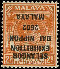 1942 Selangor Exhibition 2c orange with overprint inverted, large part o.g. BPA Certificate (2023). SG J90b, £325