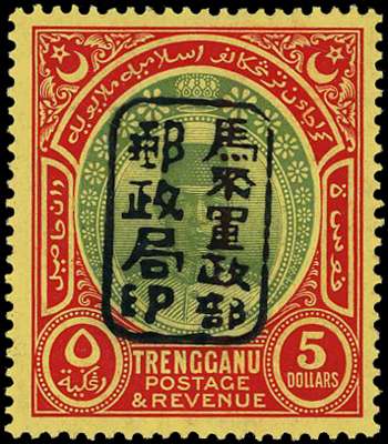 1942 Trengganu $5 green and red on yellow paper with Chop E in black, unused with traces of gum. BPA Certificate (2023), 'part original gum'; fine appearance. SG J115, £400