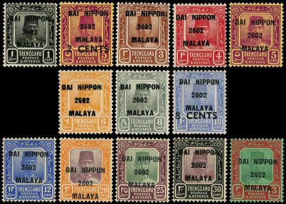 1942 Trengganu with DAI NIPPON 2602 MALAYA, large part o.g. The set less the 2c green (thirteen stamps), fine large...