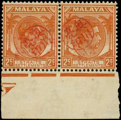 Japanese Occupation. 1942 2c Straits marginal pair with part centre guide with the Okugawa Akira Revenue Seal in red, minor toning on the reverse. Clear BPA Certificate (2023). ISC GHT2; see footnote after SG J76