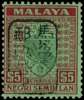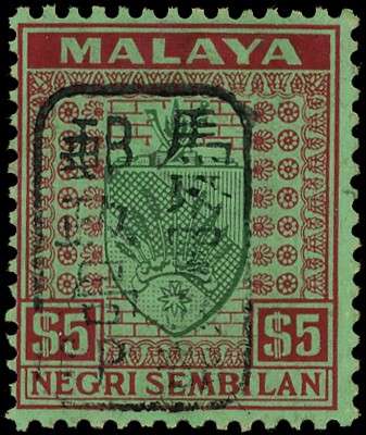 1942 Negri Sembilan $5 green and red on emerald paper with Chop E in black, large part o.g., fine. SG...