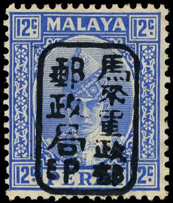 1942 Perak 12c bright ultramarine Chop E in black, fine large part o.g. SG J197, £325