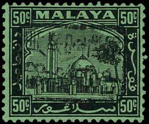 1942 Selangor 50c black on emerald paper with Chop A sideways in black, large part o.g.,...