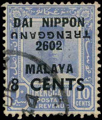 Trengganu. 1944 TRENGGANU (inverted) on Trengganu 8c on 10c bright blue overprinted DAI NIPPON 2602 MALAYA, fine used with part Dungun cancel showing date DE 44. BPA Certificate (2023). SG TT6, £1000