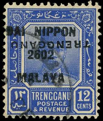 Trengganu. 1944 TRENGGANU (inverted) on Trengganu 12c bright ultramarine with DAI NIPPON 2602 MALAYA overprint, fine used with part Dungun cancel. BPA Certificate (2023); rare. SG TT7, £1100