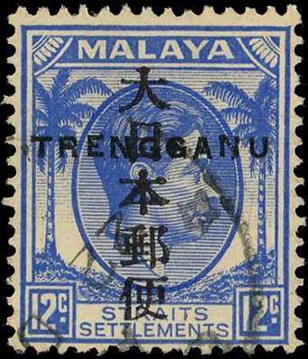 Trengganu. 1944 TRENGGANU on Straits 12c ultramarine with Kanji overprint, with part Dungun cancel showing date 22 DE. BPA Certificate (2023); rare. SG TT8, £1100