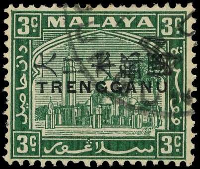 Trengganu. 1944 TRENGGANU on Selangor 3c green with Kanji overprint, used with part Dungun cancel showing date D(E) 44. A couple of short perfs at left. BPA Certificate (2023). SG TT14, £700