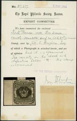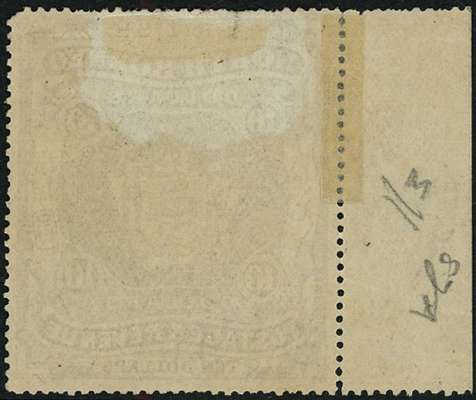 1889 $10 brown left marginal with R2/1 DOLLAPS at foot, part o.g. with an area of missing gum, selvedge splitting away (in part reinforced), short perfs at top, creased and with a blunt top right corner. Despite the defects, a fair example of a rare stamp, last sold at Harmers (7.2.56). RPS Certificate (1945) when SG 37B. SG 50b, £1500