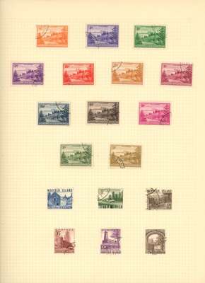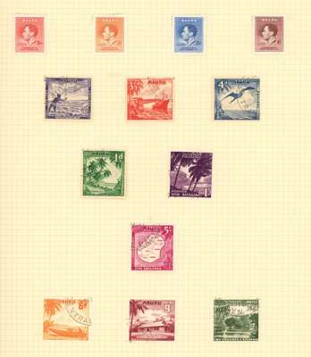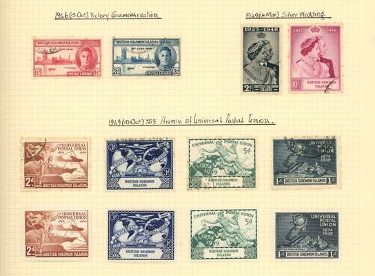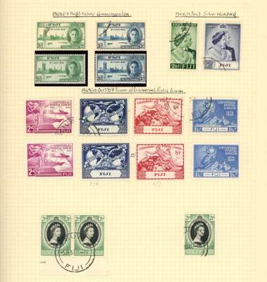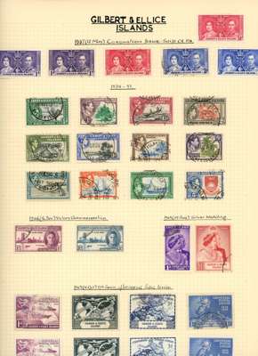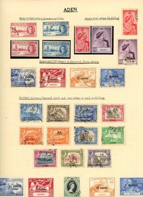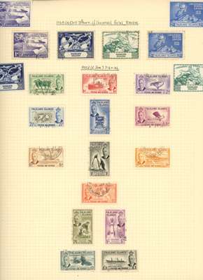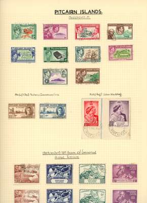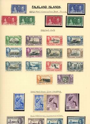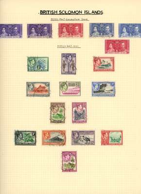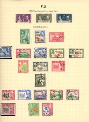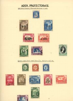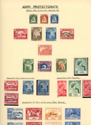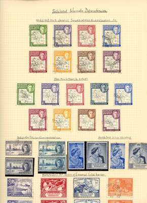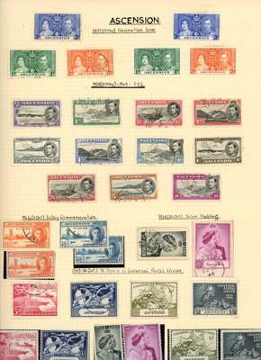 Collection (hundreds) mainly KG VI on Philatelic leaves including Aden Dhow set o.g. (5r aniline), some foxing, also Kathiri 1942 set used; Ascension values to 10/- used, also wedding unmounted o.g. and used; Solomons 1939 set used; Falklands Wedding unmounted o.g., 1952 set used, Dependencies; Fiji values to £1 used; GEI 1939 set used; Pitcairn, and Tristan 1952 set used. Some foxing issues but those mentioned are generally fine