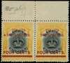 1906 4c on Labuan 12c black and yellow top marginal pair, o.g., the left stamp showing R1/8 no stop after CENTS. Hinged...