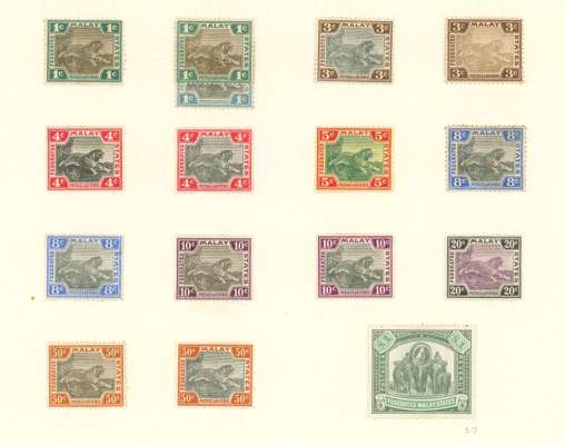 1900-34 mint and used collection (217) on leaves, condition very mixed with some toning, heavy mounts, fiscal cancels but should repay careful viewing. Includes SG 2, 6 and 10 fine used, and overprints on Negri Sembilan and Perak mint values to $5 (no 25c) and $25 Specimen (good appearance but has been roughly mounted); thereafter mint and used ranges with shades, 1934 values to $5 Tiger, this fine large part o.g. and used (with a registered cancel dated '193...')