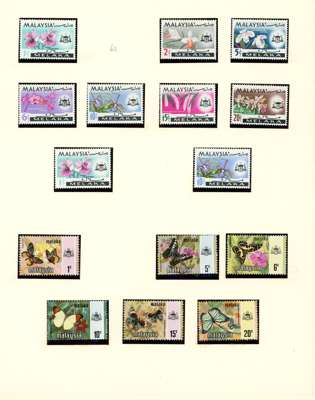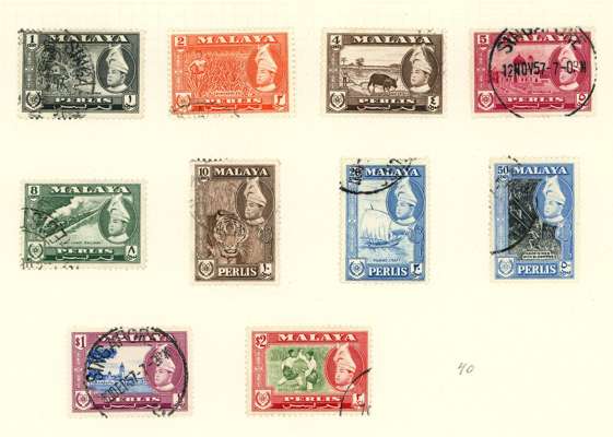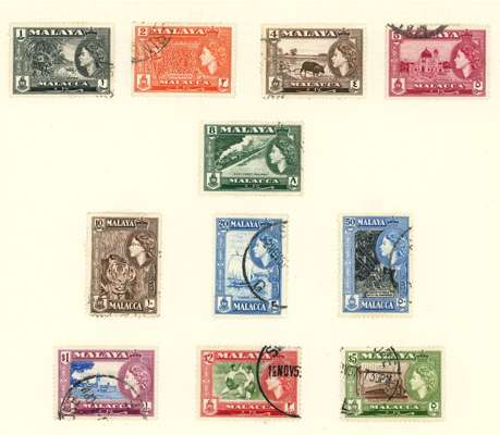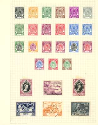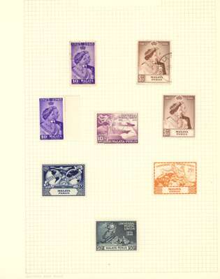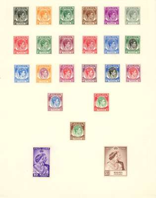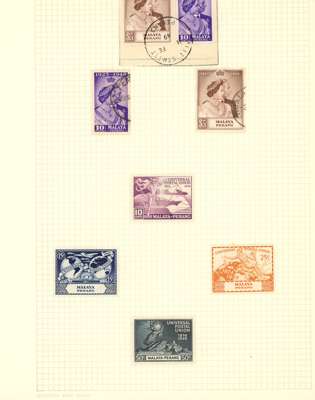 Malacca, Penang and Perlis mint and used collection on leaves. Malacca (102) with Wedding o.g. and used, 1949 set o.g. and used (the 1.9.52 values in blocks of four with first day CDSs); Penang (96) with Wedding o.g. and two used, 1949 set o.g. ($2 and $5 x 2) and used; Perlis (86) includes Wedding o.g. and used, 1951 set less 30c mint and used (used $5 poor)