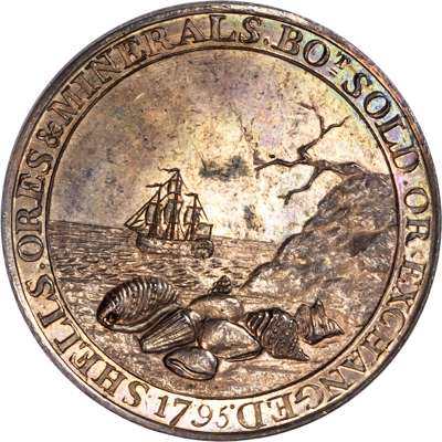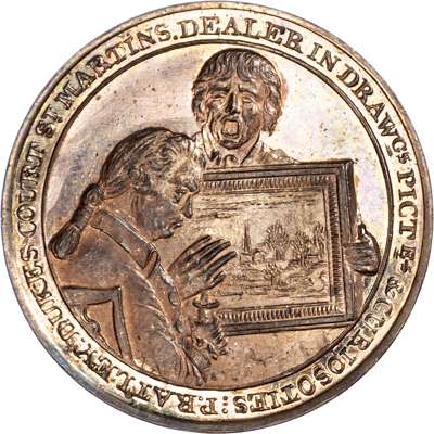 London - St. Martin’s Lane, Peter Ratley (curiosities and antiques dealer) Halfpenny 1795, Connoisseur examining an oil painting held by a yawning boy (after Henry Morland 1773), rev. Group of seashells on a beach, ship in distance on the sea, edge plain, 30mm/12.22gm. (DH 465). As struck with superb bright full original lustre, rare.
