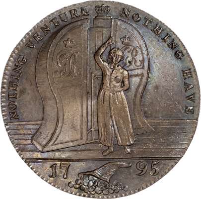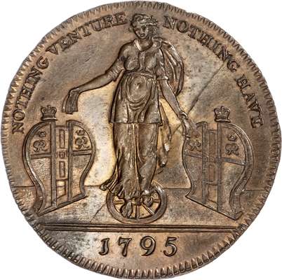 London - Cornhill, Richardson Goodluck & Co. (stockbrokers and lottery organisers) advertising Halfpenny 1795, Fortune, blindfolded, stands between two state lottery wheels, rev. 8-line legend re. lottery, edge plain, 30mm/10.78gm. (DH 467). Another similar but rev. legend letters are smaller, 31mm/10.71gm. (DH 468). Another but obv. A Blue Coat Boy (Christ’s Hospital School) drawing winning ticket, rev. 9-line legend re. prize money, edge plain, 31mm/10.74gm. (DH 471). Another the same but in brass, 30.75mm/10.98gm. (DH 471). Bronze issues good Extremely Fine, toned with remnants of original lustre, third rare, brass piece Extremely Fine with yellow toning and extremely rare in this off‑metal ‘RRR’. [4]