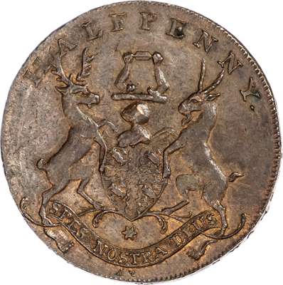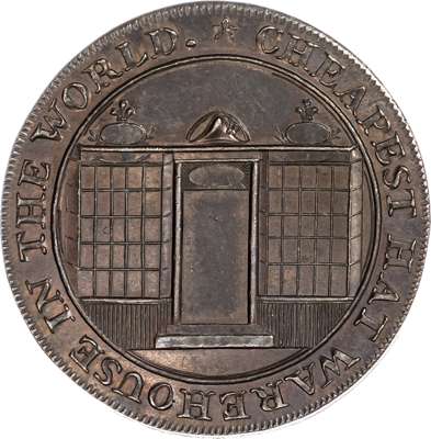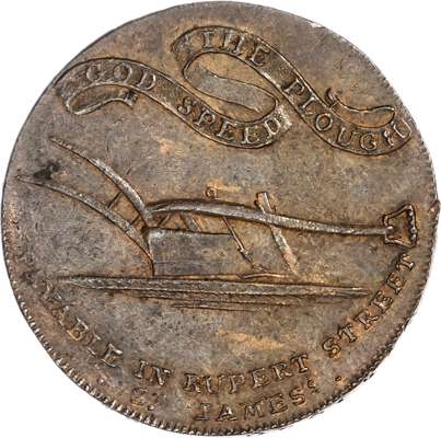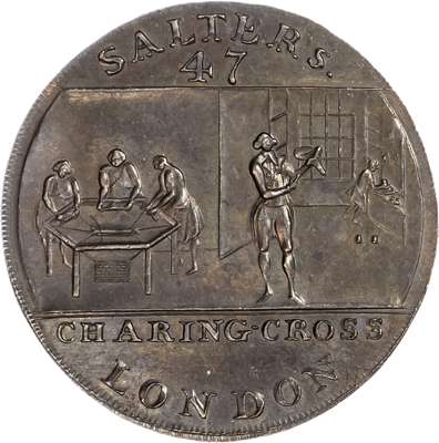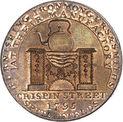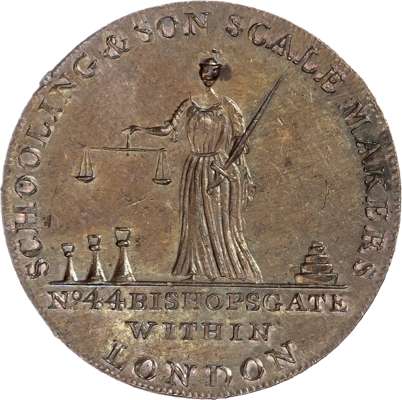 London - St. James’s, Adam Little (publican of the ‘Plough’ in Rupert St. and possibly also a currier), Halfpenny (1794-96), Curriers’ Arms, rev. a plough with text on ribbon, edge BIRMINGHAM REDRUTH & SWANSEA, 28mm/9.92gm. (DH 472a). London - Charing Cross, Salter & Co., (hat makers) Halfpenny undated, Hatmakers at work, rev. Shop front, edge plain, 29mm/10.29gm. (DH 473). London - Bishopsgate, James Schooling & Son (ironmonger & scales maker) Halfpenny 1795, Justice holding scales, rev. Kettle on fire-grate, edge plain, 29mm/11.63gm. (DH 474). All generally good Extremely Fine, toned with traces of lustre ‑ especially last which is proof‑like with good iridescence, first scarce. [3]