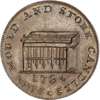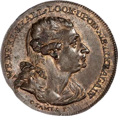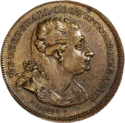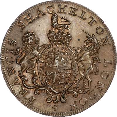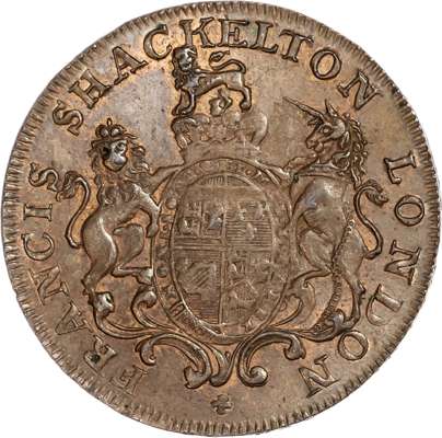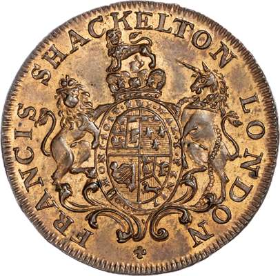 London - Haymarket, Francis Shackleton (tallow chandler) Halfpenny 1794, Royal Arms, rev. candle moulds, edge PAYABLE IN SUFFOLK STREET HAYMARKET .x., 29mm/9.17gm. (DH 476). Another similar but obv. leg. spaced slightly differently. 29mm/9.34gm. (DH 477). Another the same but edge PAYABLE IN DUBLIN OR LONDON .x., 29mm/9.19gm. (DH 477a). London - Russel Court, Sims (publican of the ‘Garrick Head’) Halfpenny undated, Bust right of Garrick, rev. Masks of comedy and tragedy surmounted by a crowned thistle, edge plain, 29mm/8.23gm. (DH 478a). Another but in brass, edge diagonally milled, 30mm/9.45gm. (DH 478). Copper pieces generally Extremely Fine or better, DH 477a with almost full lustre and rare, last off‑metal piece about Extremely Fine with yellow toning and small patch of Verdigris on rev. but extremely rare ‘RRR’. [5]