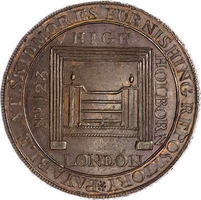 London - Holborn, Paul Skidmore mule (Willam Hallan, Birmingham) Halfpenny 1793, Bust left of Hallan left, rev. Fire-grate, rev. diagonal milling over SKIDMORE HOLBORN LONDON, 28.75mm/12.93gm. (DH 484a). Good Extremely Fine even rosy lustre that is beginning to tone, very handsome. and extremely rare ‘RRR’.