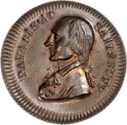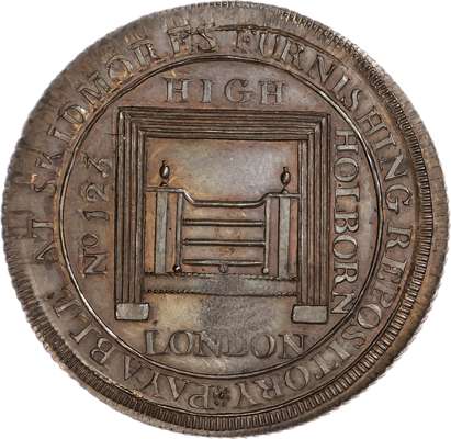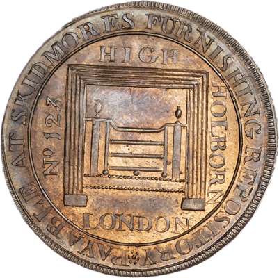 London - Holborn, Paul Skidmore mule (Willam Hallan, Birmingham) Halfpenny 1793, Bust left of Hallan left, rev. Fire-grate, rev. diagonal milling over SKIDMORE HOLBORN LONDON, 28.75mm/12.93gm. (DH 484a). Good Extremely Fine even rosy lustre that is beginning to tone, very handsome. and extremely rare ‘RRR’.