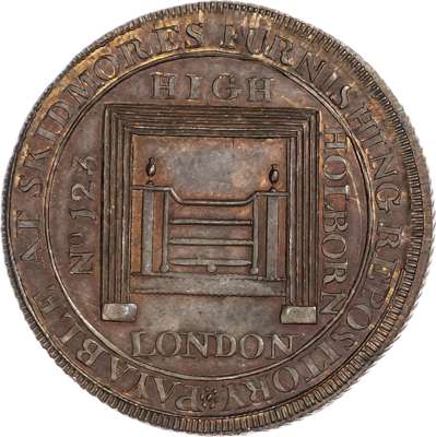 London - Holborn, Paul Skidmore mule (T Santer, Kidderminster) Halfpenny 1791, Kidderminster arms, rev. Fire-grate, edge diagonally milled 30mm/9.5gm (DH 488a). Good Extremely Fine toned with a trace of lustre, extremely rare ‘RRR’.