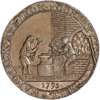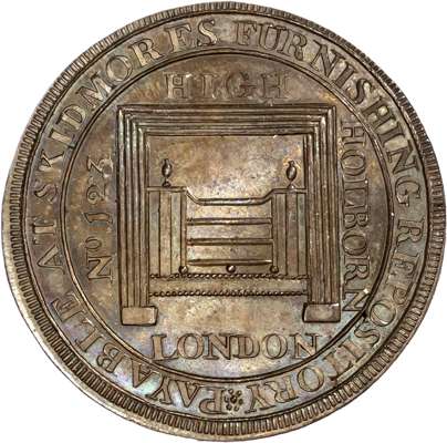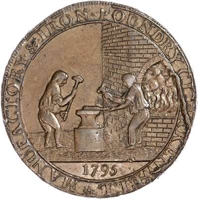 London - Covent Garden, Paul Skidmore Social Series mule Halfpenny 1795, St. Paul’s church destroyed by fire, rev. Fire-grate, edge plain, 30mm/11/18gm. (DH 527). Another mule but rev. two men working in a forge, 28.75mm/12.67gm. (DH 528). First good Extremely Fine, toned, iridescent with a trace of lustre, small spot of oxidation on obv., second Extremely Fine and toned, both very rare ‘RR’. [2]