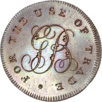 London - Hyde Park, Paul Skidmore specious Halfpenny undated, Man skating right, rev. GB cypher, edge diagonally milled, 29mm/9.15gm. (DH 535). Good Extremely Fine, beautiful toning, blue iridescence with hints of original lustre and almost proof-like, superb and rare.