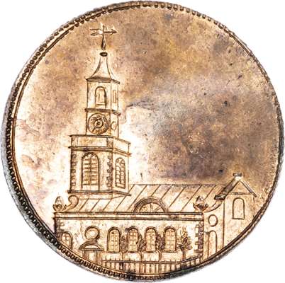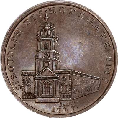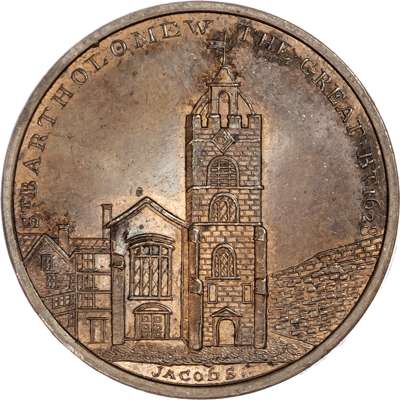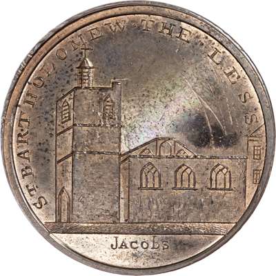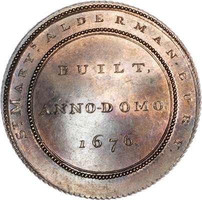London - Holborn, Paul Skidmore’s ‘London Churches Series’ Halfpenny, St. Mary’s Aldermanbury, rev. 3-line leg. edge coarsely milled, 28.25mm/12.11gm. (DH 539c). St. Ann’s Aldersgate, rev. PSCo cypher, edge plain, 28.75mm. (DH 540). St. Bartholomew the Great, West Smithfield, rev. PSCo cypher, 29mm/11.46gm. (DH 542). St. Bartholomew the Less, West Smithfield, rev. PSCo cypher, 29mm/11.11gm. (DH 544). St. Botolph, Bishopsgate, rev. PSCo cypher 28.5mm/11.74gm. (DH 549a). Generally good Extremely Fine, first with much lustre, rest toned, second lacquered. [5]