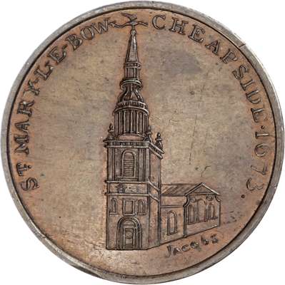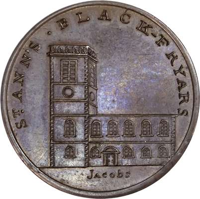 London - Holborn, Paul Skidmore’s ‘London Churches Series’ Halfpenny, Great St. Helens, Bishop Street, rev. PSCo cypher 1797, 29mm/12.24gm. (DH 552). St. Ann’s, Blackfriars, rev. PSCo cypher 1797, 28.75mm/9.73gm. (DH 554). St. Botolph’s (St. George), Botolph Lane, rev. PSCo cypher, 28.75mm/12.28gm. (DH 556a). St. Mary le Bow, Cheapside, rev. PMCo cypher 1797,28.75mm/9.50gm. (DH 563). St. James’s Clerkenwell, rev. PMCo cypher 1797, 29mm/9.48gm. (DH 564). All good Extremely Fine, first and last with much lustre, second toned, third full lustre but lacquered, first very rare ‘RR’ as die crack on obv., soon broke. [5]