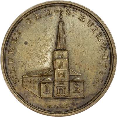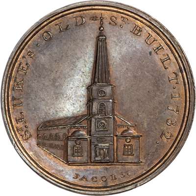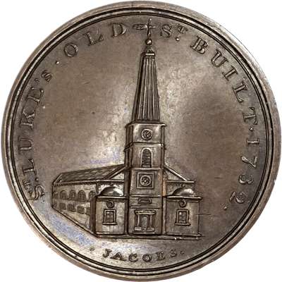 London - Holborn, Paul Skidmore’s ‘London Churches Series’ Halfpenny, St. Olave, Old Jewry, rev. PSCo cypher, 29mm/14.46gm. (DH 614a). St. Luke’s, Old Street, rev. Bible in wreath, with lettered edge, 27mm/12.36gm. (DH 615). St. Luke’s, Old Street, in brass 27mm/12.57gm. (DH 615). St. Luke’s, Old Street, edge, lightly diagonally milled, 27.5mm/9.21gm. (DH 615). St. Luke’s, Old Street, edge, plain, 27mm/12.36gm. (DH 615). Copper pieces good Extremely Fine, first with near full mint lustre, last almost bronzed, brass piece almost Extremely Fine and extremely rare in this off‑metal ‘RRR’, fourth and fifth also rare. [5]