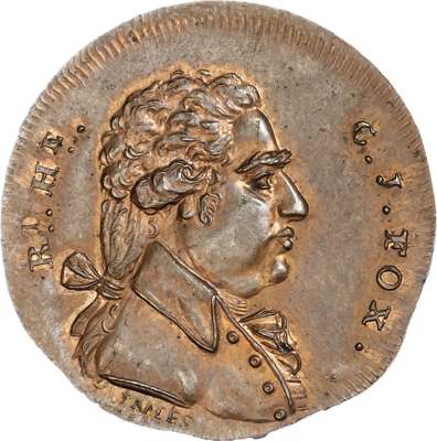 London - Holborn, Thomas Spence Halfpenny undated, 9-line advertisement, rev. draped bust right of the radical and pro republican MP Charles Fox, edge plain, 30mm/10.13gm. (DH 695). Well struck, good Extremely Fine and with a large amount of original mint lustre, very rare ‘RR’.