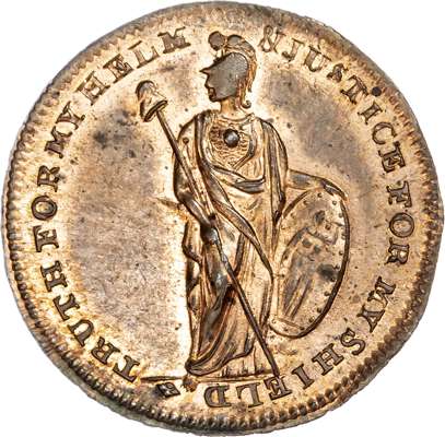 London - Holborn, Thomas Spence Halfpenny undated, 9-line advertisement, rev. Minerva standing half right holding Cap of Liberty and Shield of Justice, edge plain, 30mm/12.47gm. (DH 699). Well struck, although Minerva’s head lacking a bit of detail, good Extremely Fine with full blazing original mint lustre, superb and scarce.