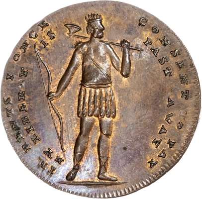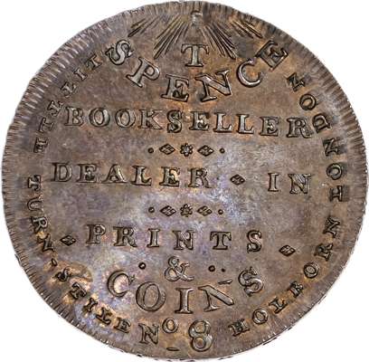 London - Holborn, Thomas Spence Halfpenny undated, 9-line advertisement, rev. American Indian standing holding a bow and tomahawk, edge SPENCE DEALER x IN x COINS x LONDON x, 30mm/12.02gm. (DH 711). Well struck, good Extremely Fine with considerable amounts of original mint lustre and iridescence, rare.