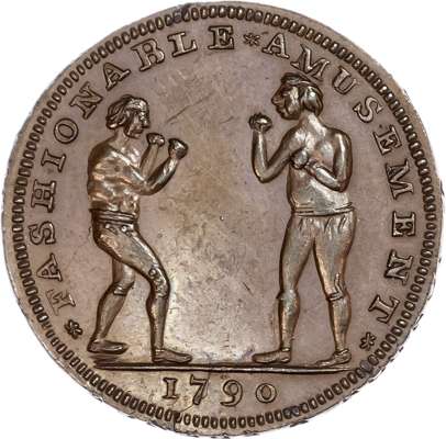 London - Holborn, Thomas Spence bronzed Halfpenny 1796, A Screw Press, rev. Two boxers facing each other, edge SPENCE DEALER x IN x COINS x LONDON x, 28.5mm/10.21gm. (DH 740). Well struck, hairline flan crack visible on obv., otherwise good Extremely Fine, bronzed and reflective, scarce.