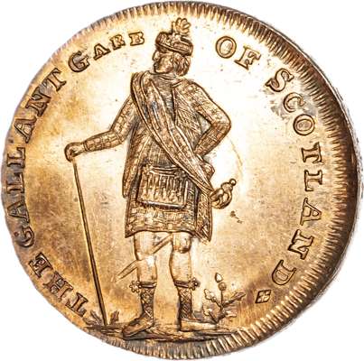 London - Holborn, Thomas Spence Halfpenny 1796, A Screw Press, rev. A Highlander standing in national dress (kilt), edge SPENCE DEALER x IN x COINS x LONDON x, 29.5mm/12.72gm. (DH 742). Well struck, die crack on obv., good Extremely Fine, obv. toned and rev. full lustre (this side possibly once lacquered), scarce.